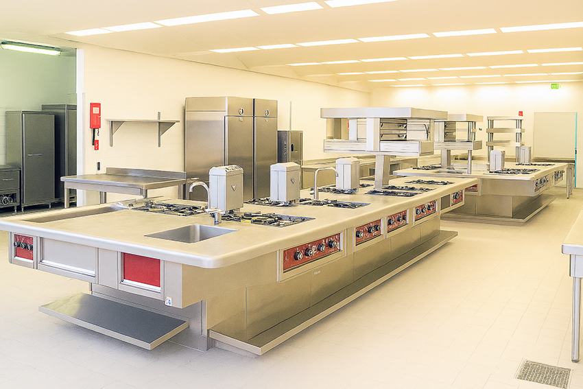 Les 8 postes de la cuisine pédagogique étaient mal répartis dans l'espace. BEGC a donc défini des solutions de réorganisation de cette zone.